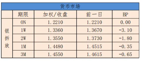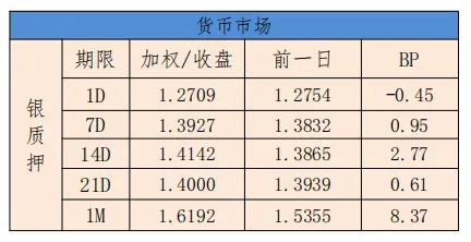 今日银行间市场主要回购利率整体上行。隔夜加权平均利率收盘于1.2709%,上日的收盘价为1.2754%,下行0.45BP;14天收盘价为1.4142%,相比较昨天的收盘价格1.3865%,上行2.77BP。