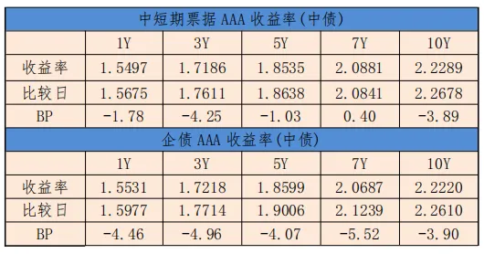 中债中短期票据收益率曲线(AAA)1年期收益率下行1.78BP,至1.5497%,3年期收益率下行4.25BP,至1.7186%。