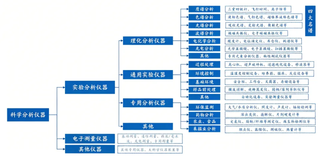 其中,分析仪器是科学仪器的重要组成部分,编号为01,其下又细分为多个中类和小类。质谱、色谱、光谱、波谱是其代表性的核心品类,被业内统称为“四大名谱”。