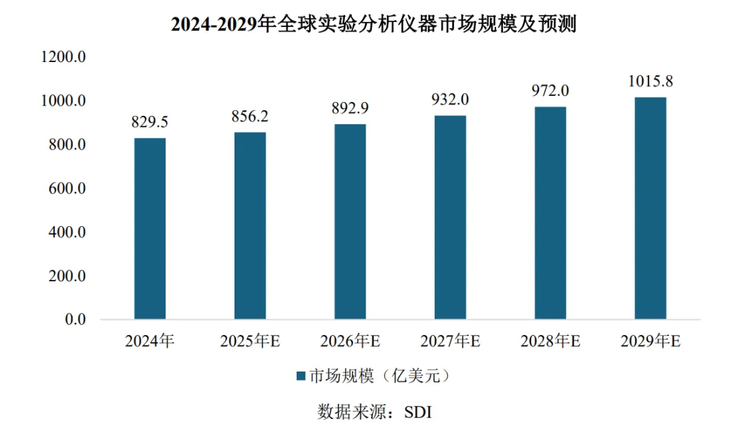 根据研究机构SDI的报告,2024年全球实验分析仪器行业市场规模为829.5亿美元(约合人民币5,889.4亿元),预计至2029年市场规模将增至1015.8亿美元左右(约合人民币 7,212.2 亿元),未来五年平均年增长率为4.10%。全球科学仪器市场呈现出稳健向好的增长态势。