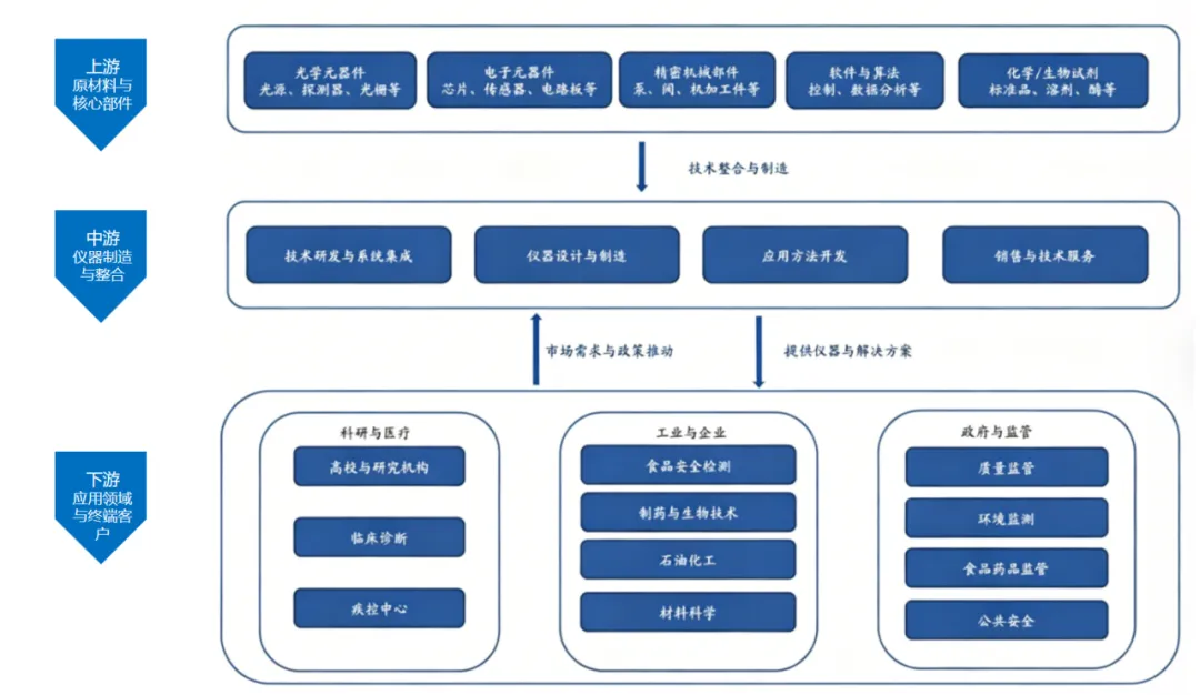 科学仪器产业链呈现清晰的“上游零部件—中游整机—下游应用”三级结构。上游核心零部件决定仪器性能,中游整机制造为产业核心载体,下游应用场景则是需求引擎。