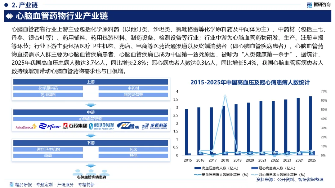 行业发展有利因素:心脑血管药物直接需求人群主要为心脑血管疾病患者,心脑血管疾病已成为中国第一致死原因,被喻为“人类健康第一杀手”,据统计,2025年我国高血压患病人数达3.7亿人,同比增长2.8%;冠心病患者人数达0.3亿人,同比增长5.4%,我国心脑血管疾病患者人数持续增加带动心脑血管药物需求也与日俱增。
