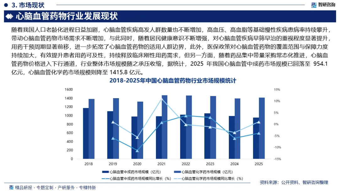市场规模:随着我国人口老龄化进程日益加剧,心脑血管疾病高发人群数量也不断增加,高血压、高血脂等基础慢性疾病患病率持续攀升,带动心脑血管药物市场需求不断增加,与此同时,随着居民健康意识不断增强,对心脑血管疾病早筛早治的重视程度显著提升,用药干预周期显著前移,进一步拓宽了心脑血管药物的适用人群边界,此外,医保政策对心脑血管药物的覆盖范围与保障力度持续加大,有效提升患者用药可及性,持续释放临床刚性用药需求,但另一方面,随着药品集中带量采购常态化推进,心脑血管药物价格进入下行通道,行业整体市场规模随之承压收缩,据统计,2025 年我国心脑血管中成药市场规模已回落至954.1亿元,心脑血管化学药市场规模则降至 1415.8 亿元。