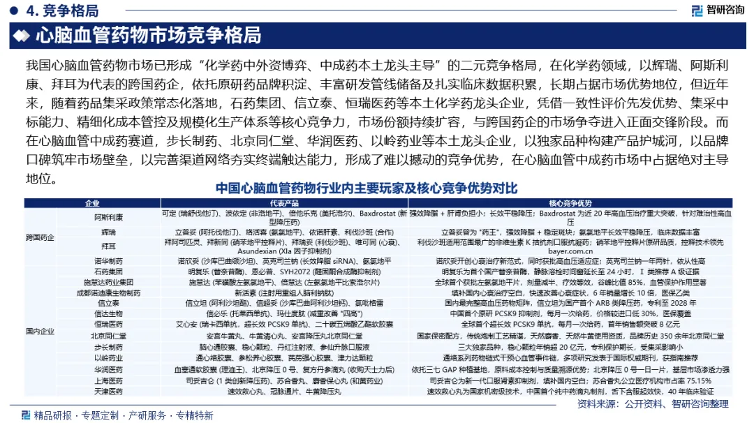市场竞争格局:我国心脑血管药物市场已形成“化学药中外资博弈、中成药本土龙头主导”的二元竞争格局,在化学药领域,以辉瑞、阿斯利康、拜耳为代表的跨国药企,依托原研药品牌积淀、丰富研发管线储备及扎实临床数据积累,长期占据市场优势地位,但近年来,随着药品集采政策常态化落地,石药集团、信立泰、恒瑞医药等本土化学药龙头企业,凭借一致性评价先发优势、集采中标能力、精细化成本管控及规模化生产体系等核心竞争力,市场份额持续扩容,与跨国药企的市场争夺进入正面交锋阶段。而在心脑血管中成药赛道,步长制药、北京同仁堂、华润医药、以岭药业等本土龙头企业,以独家品种构建产品护城河,以品牌口碑筑牢市场壁垒,以完善渠道网络夯实终端触达能力,形成了难以撼动的竞争优势,在心脑血管中成药市场中占据绝对主导地位。