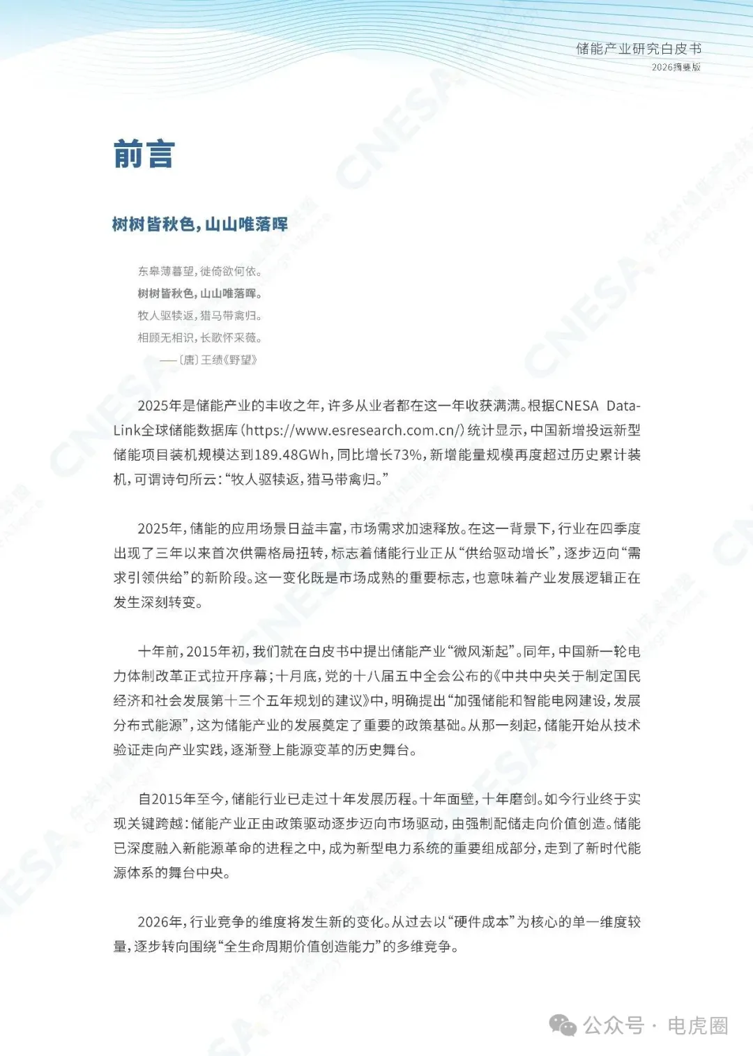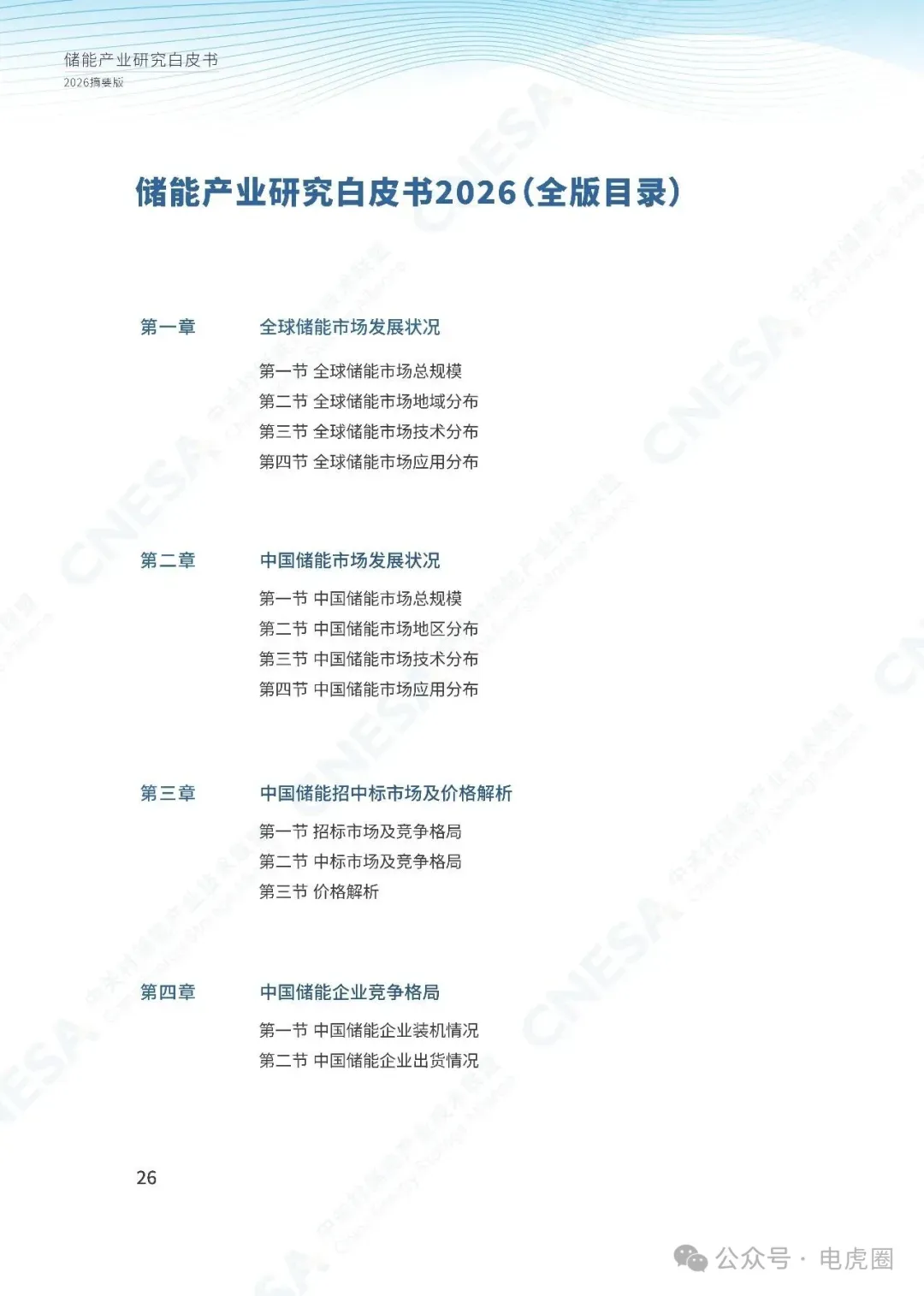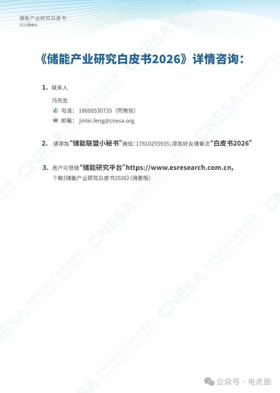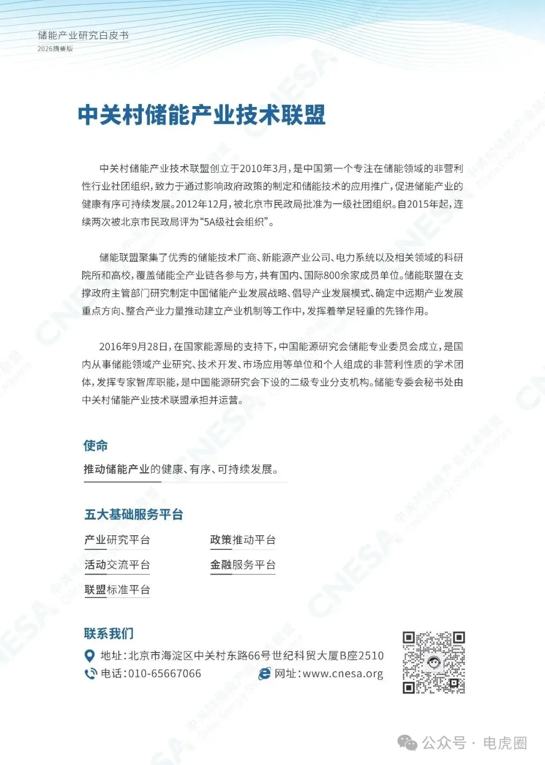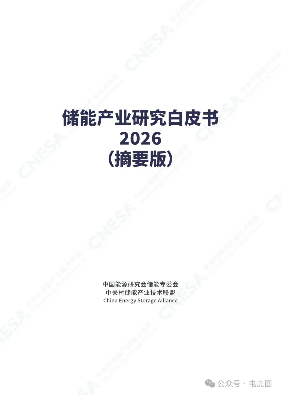 《储能产业研究白皮书2026》系统梳理并深入总结了全球主要国家和地区的市场规模、招中标市场及价格、企业出货与装机、典型企业订单与产品、政策与电力市场规则、储能安全与标准、投融资进展等多个维度,并结合当前产业格局与前沿技术趋势,对未来市场机遇与发展规模作出了前瞻性研判。