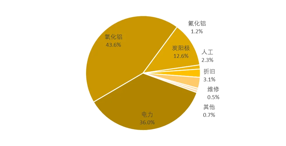 要制造电解铝主要需要三个东西:氧化铝、阳极、电力,而其中氧化铝又来自铝土矿,成本组成大致如下: