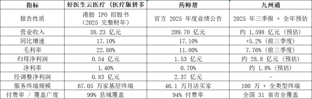 论终端布局,九州通胜在覆盖广度,好医生云医疗赢在基层深度,药师帮则强在转化效率,三者精准匹配不同终端的核心需求。