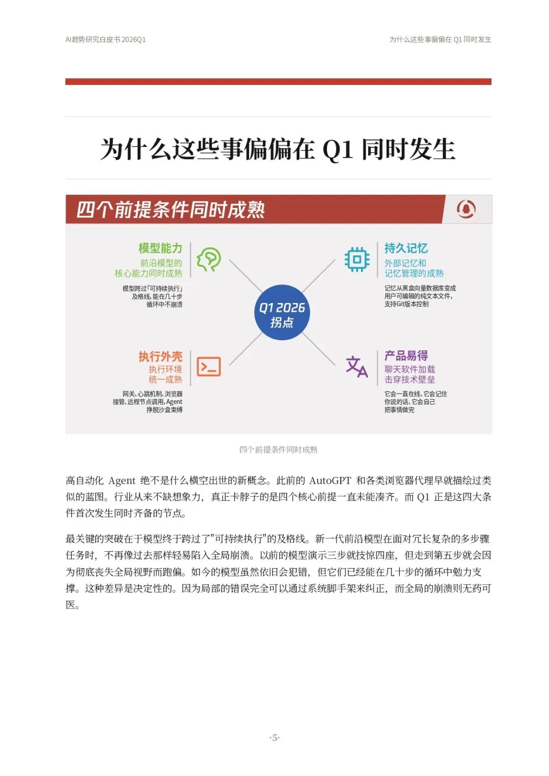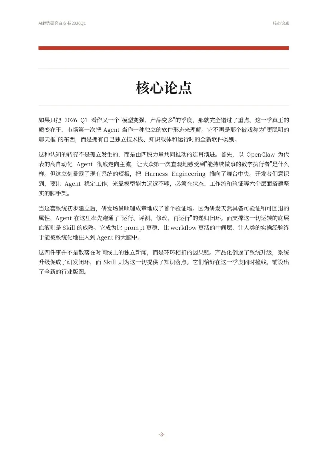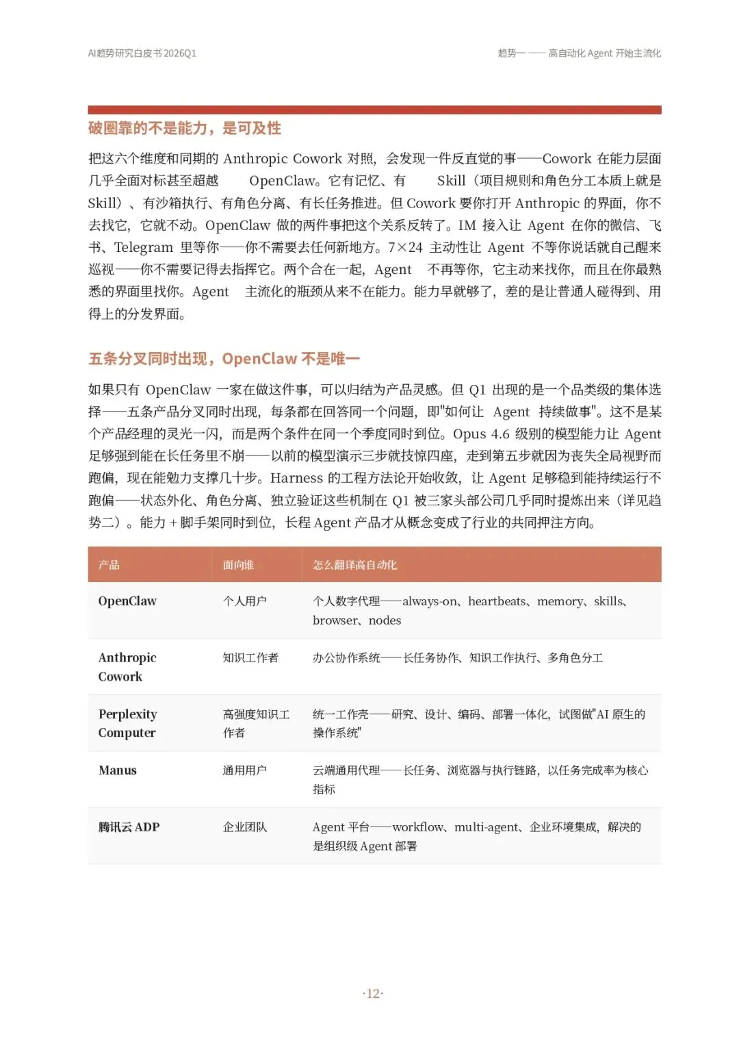 腾讯发布了《2026年Q1 AI趋势研究白皮书》,这份近150页的报告,清晰地向我们揭示:2026年第一季度,AI Agent完成了一次根本性的身份转变——从“更聪明的聊天机器人”演变为一种全新的、独立的“持续运行的工作系统”。