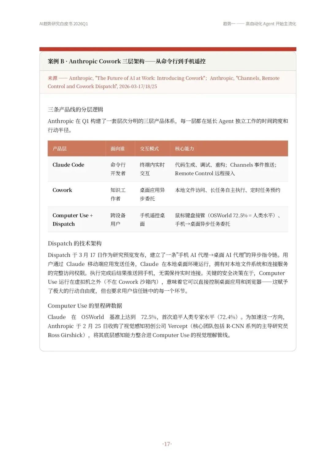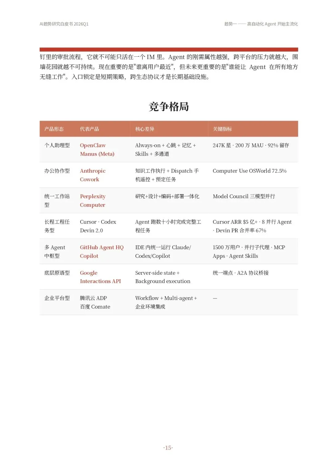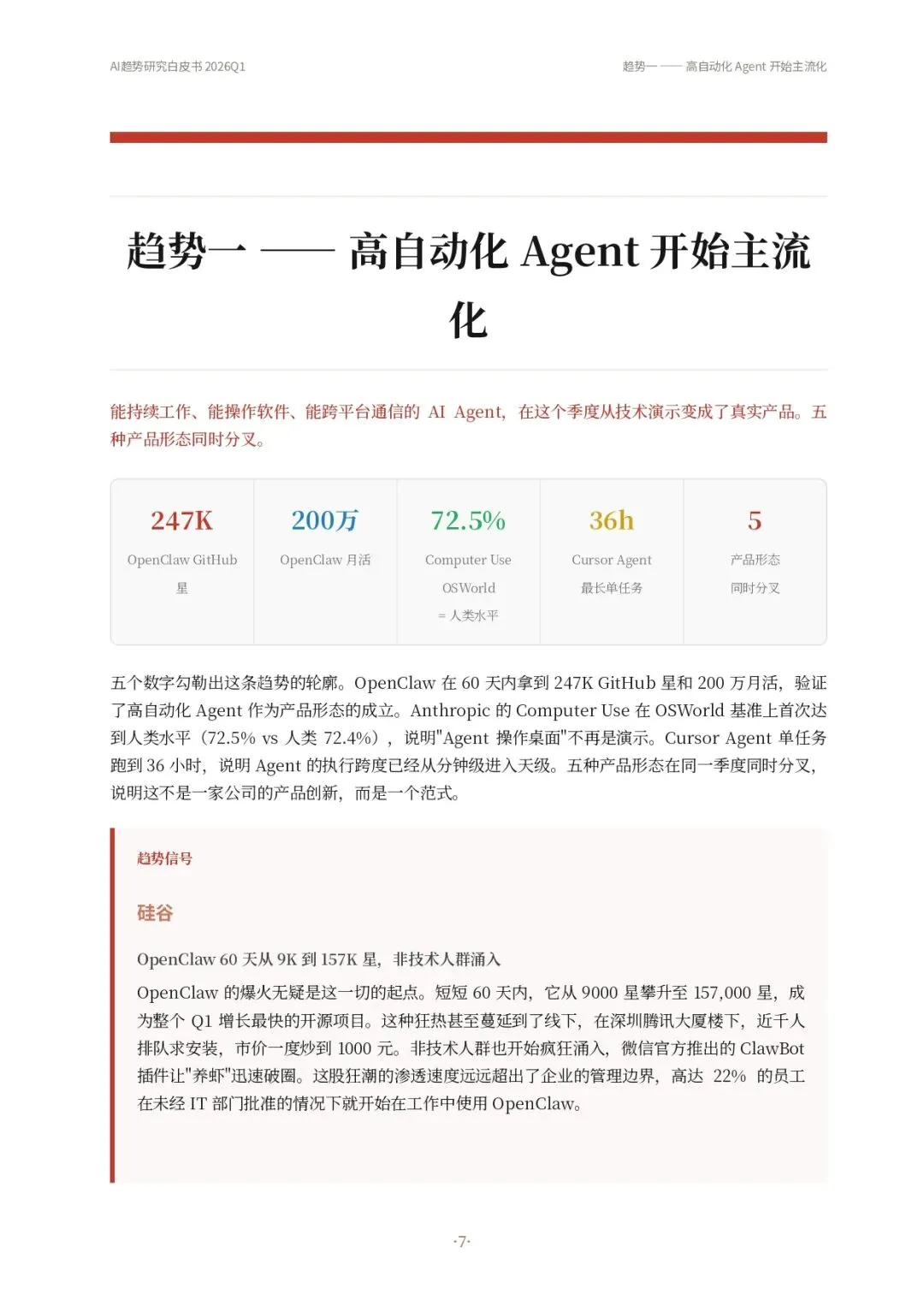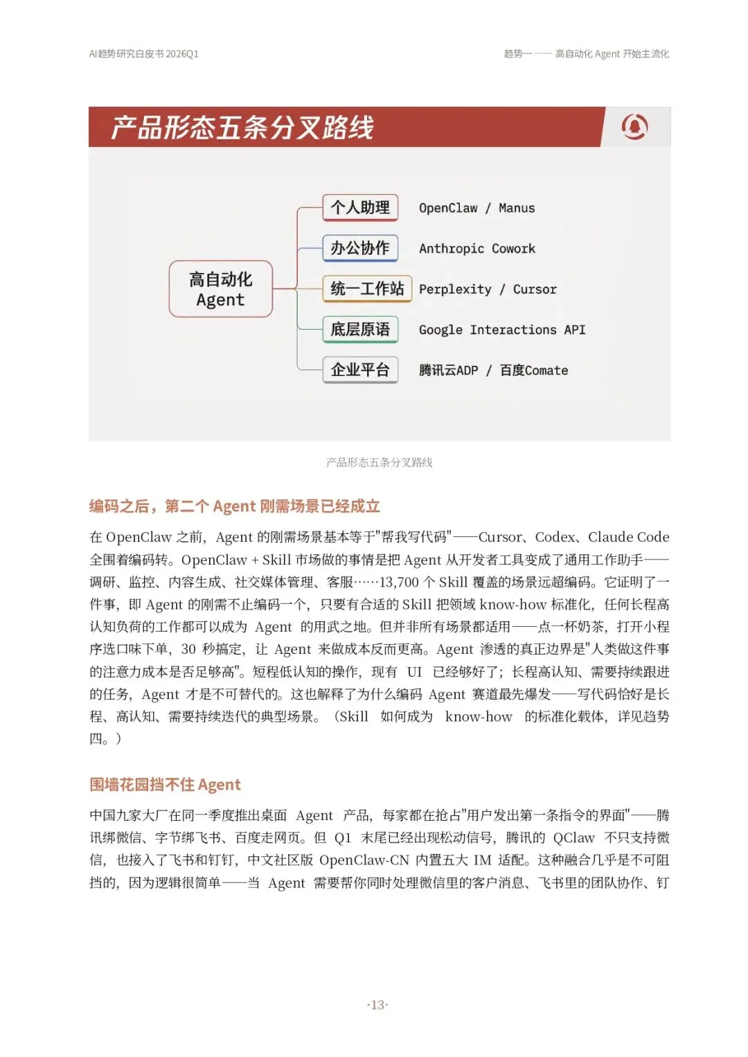 腾讯发布了《2026年Q1 AI趋势研究白皮书》,这份近150页的报告,清晰地向我们揭示:2026年第一季度,AI Agent完成了一次根本性的身份转变——从“更聪明的聊天机器人”演变为一种全新的、独立的“持续运行的工作系统”。