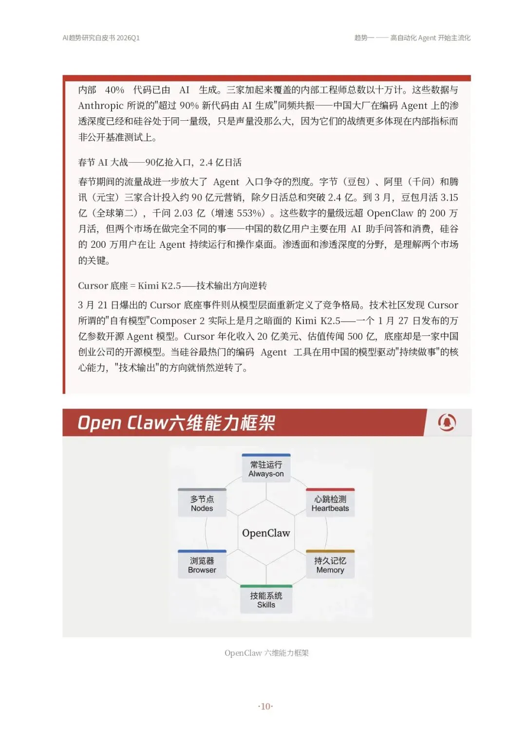 报告指出,一切始于产品体验的质变。以OpenClaw为代表的Agent,通过将“持续在线、心跳机制、持久记忆、技能库、浏览器接管、远程节点”这六项并非原创的技术进行精妙焊接,第一次让普通用户直观感受到“一个能持续帮你做事、在你熟悉的微信里主动找你的数字执行者”是什么样子。