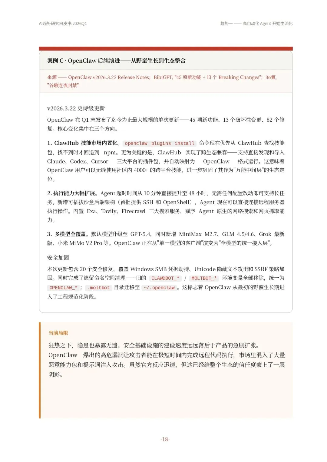 无论是ClawHub上海量的社区技能,还是企业内部的私有技能库,Skill让“资深工程师的TDD经验”、“团队特定的代码规范”得以打包、分发和复用。然而,报告也冷静指出了当前Skill生态的两大软肋:脆弱的主动触发机制(Agent在多数情况下想不起调用它)和严峻的供应链安全问题(恶意Skill与提示词注入)。这预示了下个阶段Skill平台竞争的关键:安全、治理与触发智能。