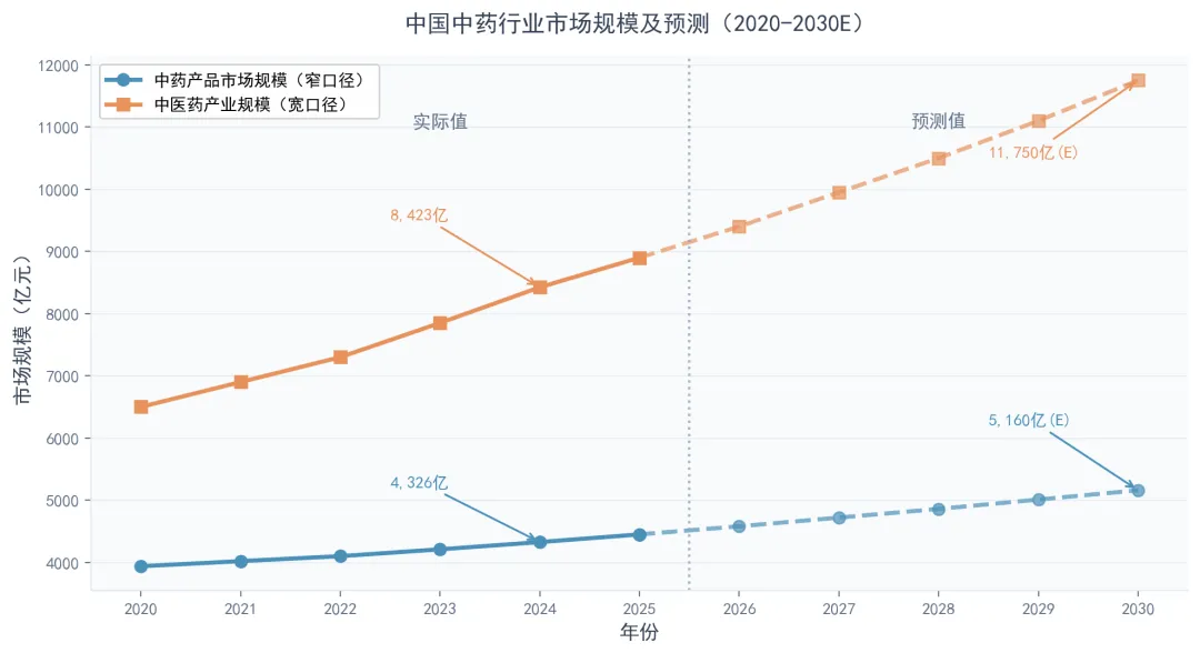 本报告采用“宽口径”与“窄口径”双视角分析框架。窄口径仅包含中药产品(中成药、饮片、材、配方颗粒),2024 年市场规模约 4,326 亿元;宽口径进一步纳入中医药服务、中药大健康消费品等,2024 年产业总规模约 8,423 亿元。