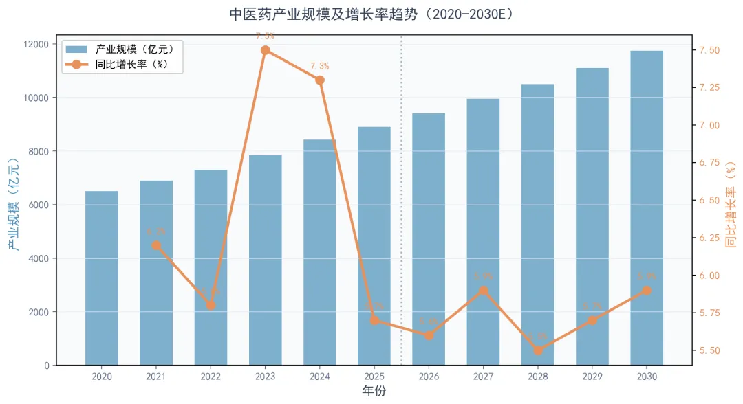 中药行业正处于从“传统产业”向“现代产业”转型的关键阶段。在政策支持、技术创新、消费升级、国际化推进等多重因素驱动下,行业将保持稳健的增长态势,预计 2026—2030 年宽口径产业规模 CAGR 约 5.7%。
