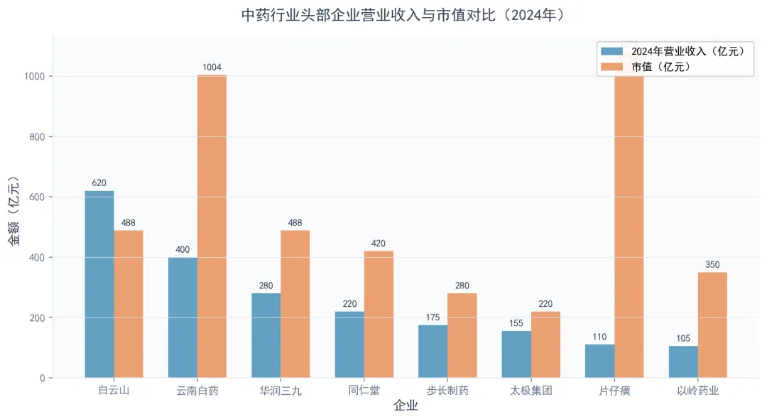 中药行业的竞争格局正在加速集中。以白云山、云南白药、华润三九、同仁堂、片仔癿等为代表的头部企业,凭借品牌优势、研发实力和渠道网络,持续扩大市场份额。白云山以超过 600 亿元的年营收位居行业第一,片仔癿则以约 1,078 亿元的市值成为市场最具投资价值的中药标的。
