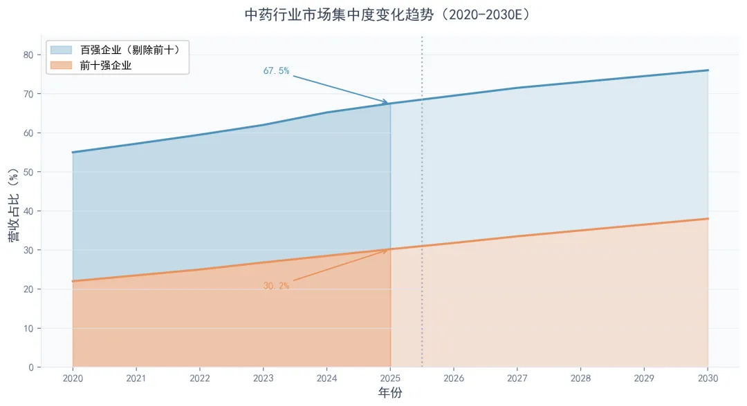 行业集中度持续提升。据统计,2025 年中药行业百强企业营收占比已达 67.5%,较 2024 年提升 2.3 个百分点;前十强企业营收占比达 30.2%。预计到 2030 年,百强企业营收占比将达到 76%,前十强占比将接近 38%。这一趋势表明,中药行业正在从“小而散”向“大而强”转变,头部企业的规模优势和品牌效应将进一步显现。