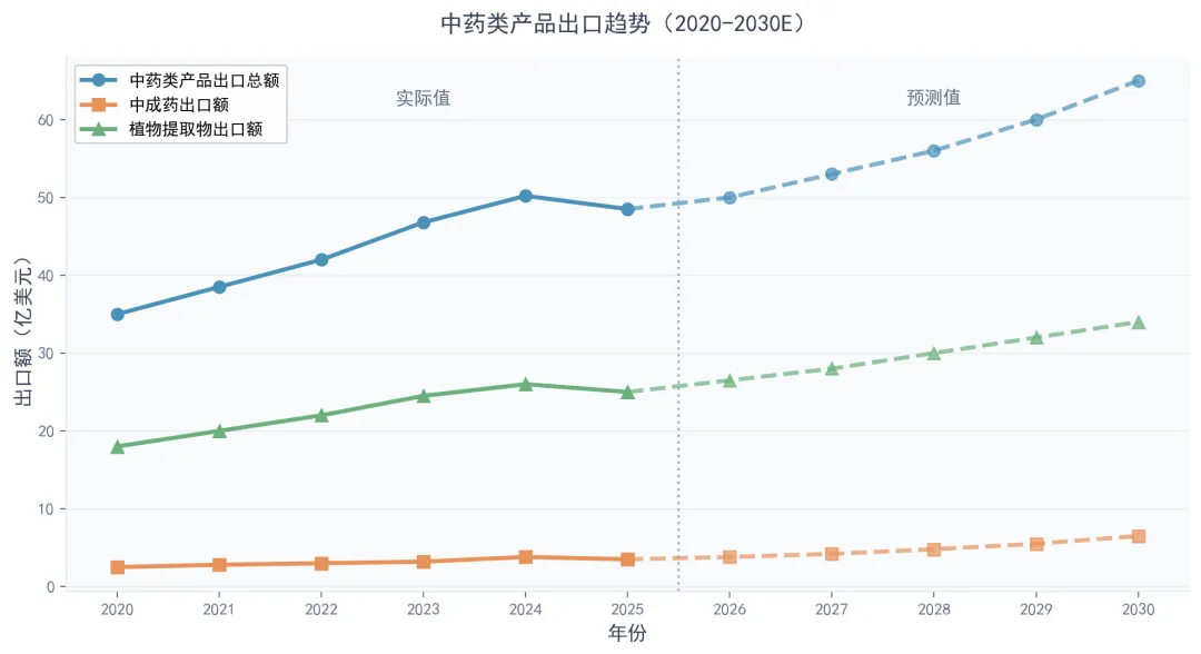 中药国际化是行业长期发展的重要方向。当前中药出口仍以低附加值的植物提取物和中药材为主,中成药出口占比较低。据统计,2025 年中药类产品出口总额约 48.5 亿美元,其中中成药出口仅 3.5 亿美元,同比下降 12.1%。