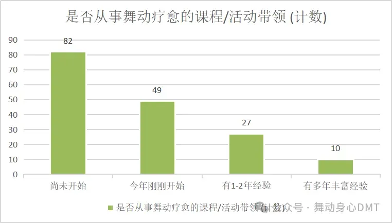 当前舞动治疗行业正处于快速发展与结构转型的关键阶段。通过对 169 份从业者问卷 的系统分析,本文从 参与行为、专业资历、身份认知与职业动机 四个维度,揭示行业人才结构的现状特征与发展瓶颈。以下为详细数据分析与解读。
