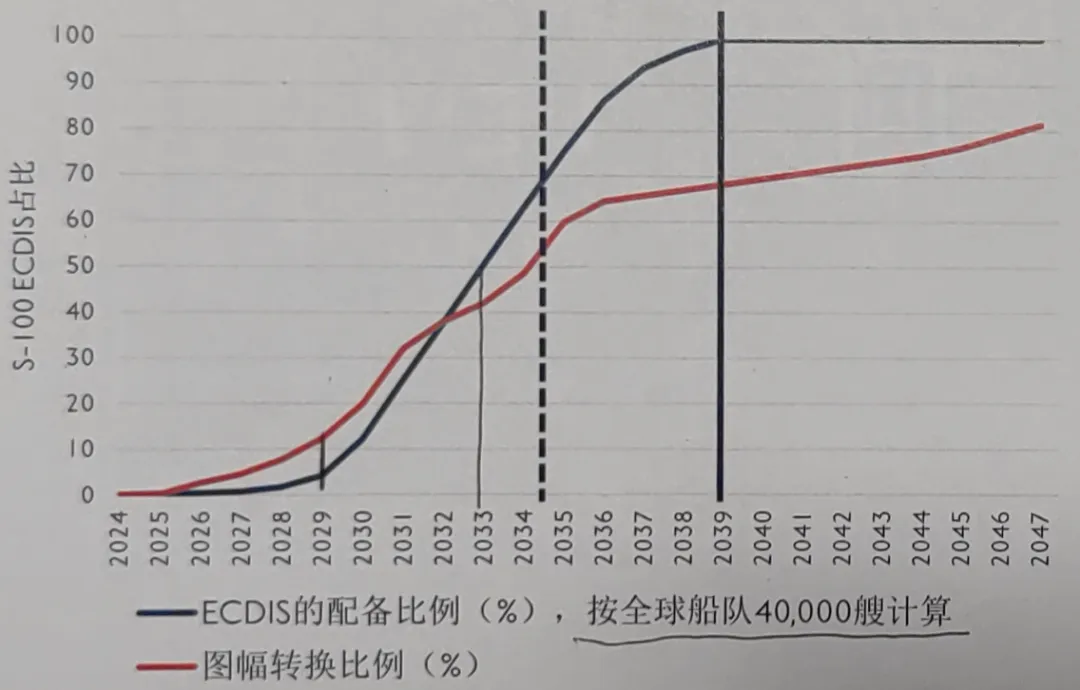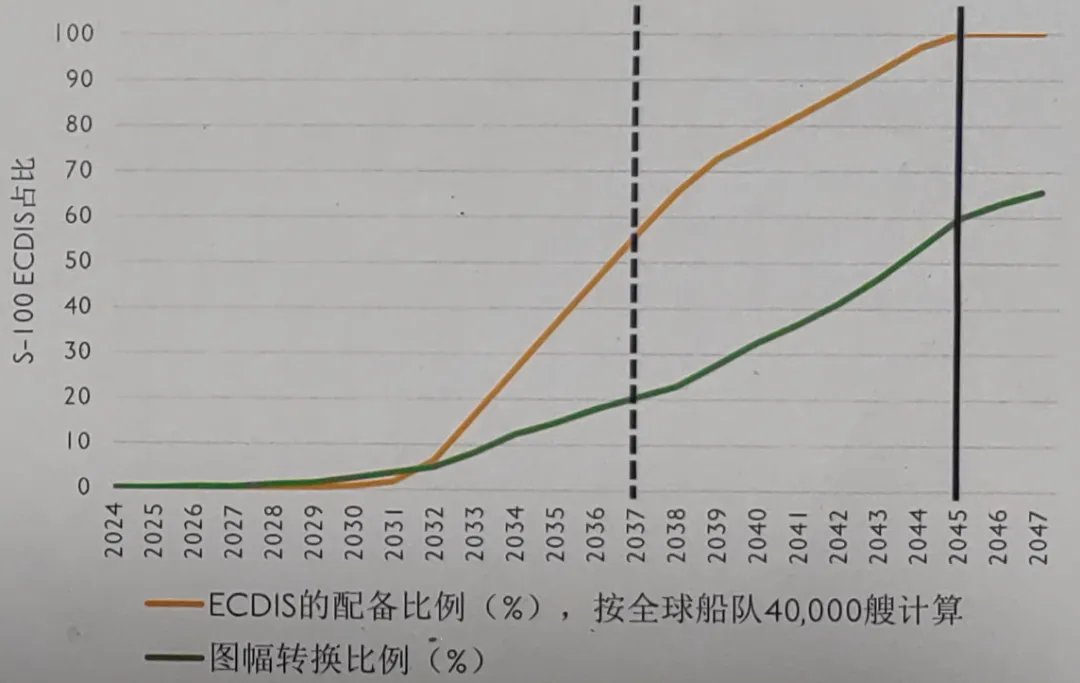 2034-2035年: 预计大多数船舶将在此期间完成设备配备;50%以上的海图完成从S-57到S-101的转换。