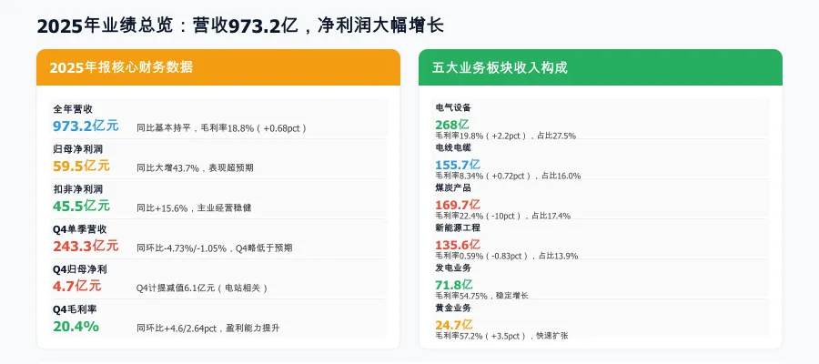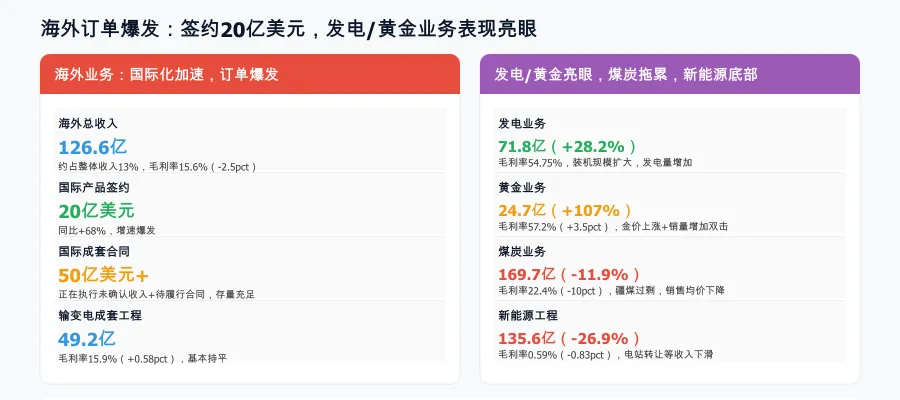 五大业务板块:电气设备收入268亿(+19.7%,毛利率19.8%)、电线电缆155.7亿(-0.78%,毛利率8.34%)、煤炭169.7亿(-11.9%,毛利率22.4%)、新能源产品及工程135.6亿(-26.9%,毛利率0.59%)、发电业务71.8亿(+28.2%,毛利率54.75%)、黄金业务24.7亿(+107%,毛利率57.2%)