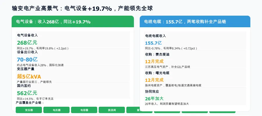 电线电缆:2025年电线电缆收入155.7亿元,毛利率8.34%(+0.72pct)。12月完成赛杰爱迪(江苏高压电气)和扬州曙光电缆两笔收购,补全GIL、核电、轨道交通用等高端电缆产品链,预计2026年收入、利润贡献将明显加大。