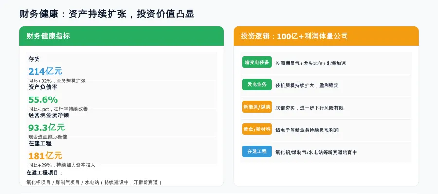 财务健康:公司资产持续扩张。存货214亿元(+32%),资产负债率55.6%(-1pct),经营活动现金净额93.3亿元,在建工程181亿元(+29%)。在建工程主要投向氧化铝、煤制气项目、水电站等,持续开辟新赛道。