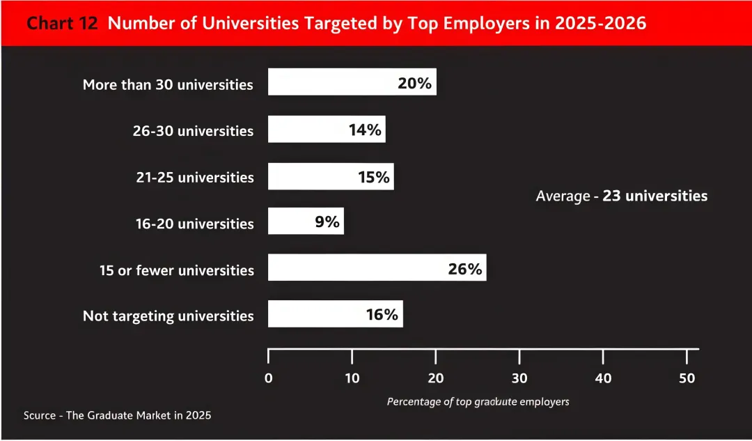 2025/26招聘季,英国头部雇主平均targeting 23所大学,另有16%的雇主完全不做university targeting。