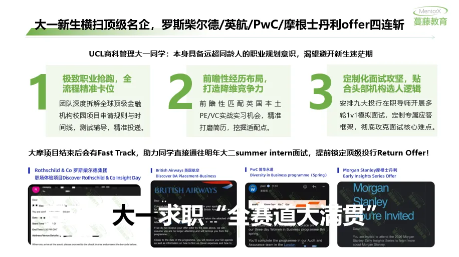 英国留学更像是一场职业投资,选校、选专业、选课、实习安排,若能以最终就业为导向,会比“先出去再看”的模糊规划更有意义。核心竞争力离不开可验证的实战能力、AI协作能力与行业适配度,学历只是基础门槛,能力才是立足的根本。 就业成功的关键,在于从入学开始无缝布局,将学业、实践、求职深度绑定,让留学经历直接转化为可落地的职业起点。 未来就业的分水岭,从来不是“是否出国留学”,而是是否以终为始做规划,提前锁定目标、持续积累能力、精准适配市场,才能在竞争中实现职业破局。 UCL大一新生极致职业抢跑案例 UCL大一新生横扫顶级名企,获罗斯柴尔德/英航/PwC/摩根士丹利offer四连斩
