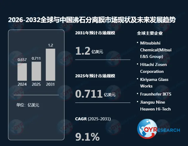根据QYR(恒州博智)的统计及预测,2025年全球沸石分离膜市场销售额达到了0.71亿美元,预计2031年将达到1.2亿美元,年复合增长率(CAGR)为9.1%(2025-2031)。