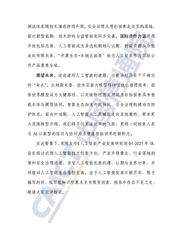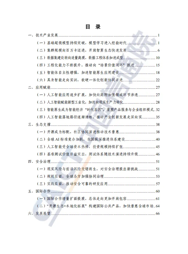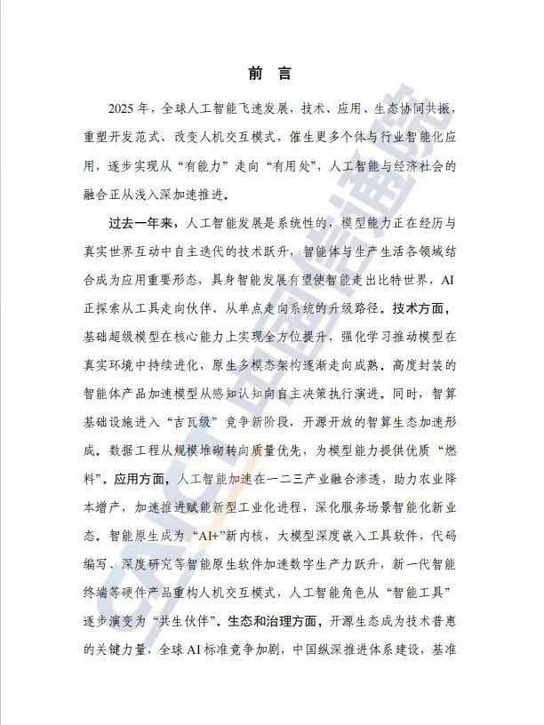 报告不仅聚焦技术,更深入剖析了人工智能如何向高附加值领域渗透,赋能新型工业化,并清晰勾勒出产业化落地的可行路径。与此同时,全球在安全治理与国际合作上呈现新动态,规则协同与开源共建成为主流。