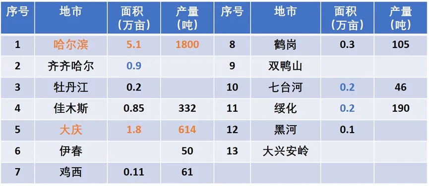 绥化市达190吨,鹤岗市养殖面积3000亩,产量105吨。