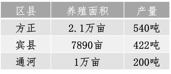 哈尔滨市养殖面积达5.1 万亩,产量1800 吨:其中方正县养殖 面积约2.1万亩,产量540吨;宾县养殖面积7890亩,产量422吨; 通河县养殖面积1万亩,产量200吨。