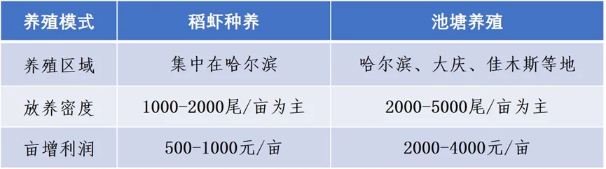 稻虾种养:集中在哈尔滨,放养密度以1000-2000尾/亩为主,亩 增利润500-1000元/亩。