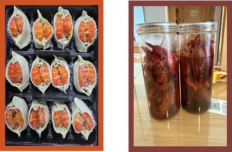 (一)加工及加工产品 有企业尝试将寒地小龙虾做成小龙虾水煎包和花雕虾,开启加工 研究。