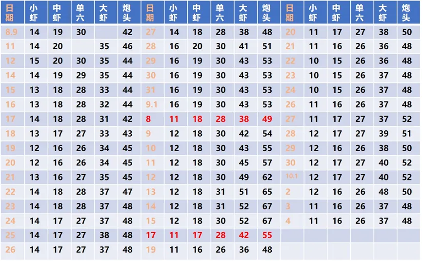 四、价格波动与市场风险 收虾标准:炮头45克以上,大虾35-44克,单六30-34克,中虾 20-29 克,小虾10-20 克。以下是2024和2025年的寒地小龙虾销售 价格。