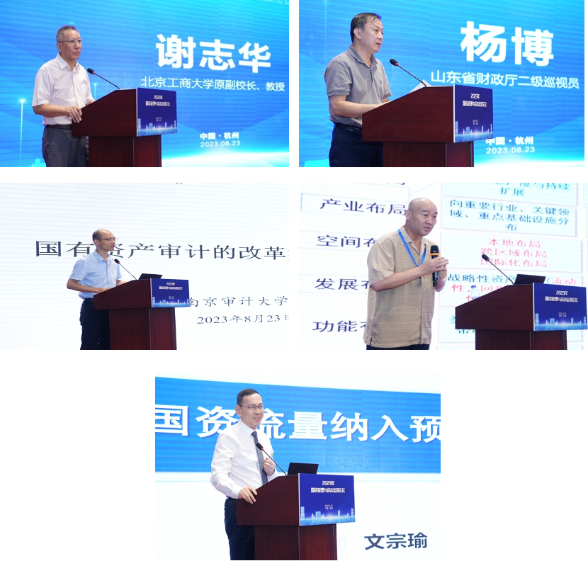 北京工商大学原副校长谢志华教授、山东省财政厅二级巡视员杨博、南京审计大学副校长陈骏教授、华彩咨询白万纲董事和中国财政科学研究院文宗瑜研究员分别从国有资产治理和管理、国有资产财会监督、国有资产审计监督、国有资本授权经营改革和国资流量补充政府预算等方面做了主题发言。