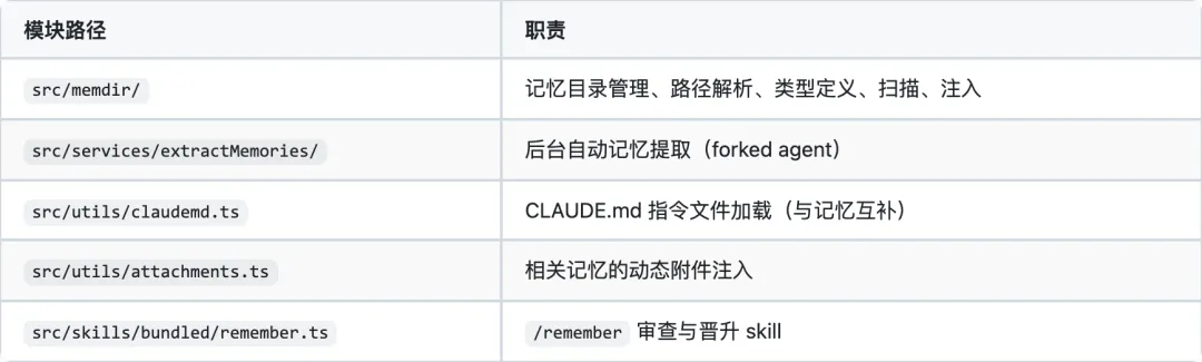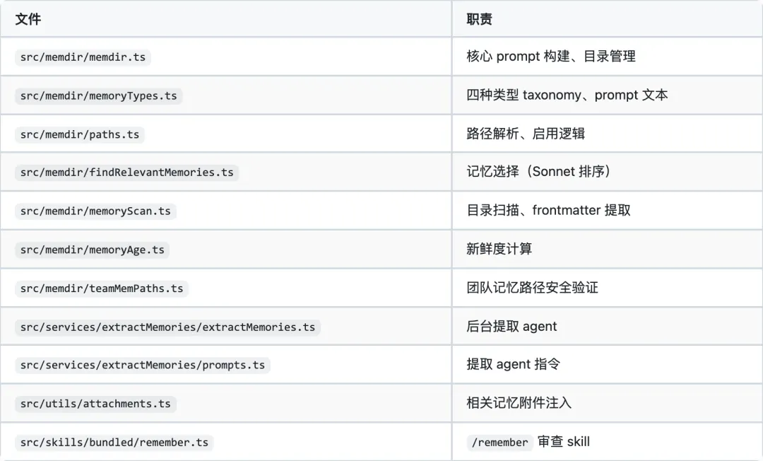~/.claude/ # 用户全局目录├── projects/{sanitized-git-root}/│ └── memory/ # 项目级私有记忆(核心)│ ├── MEMORY.md # 索引文件,始终加载到 system prompt│ ├── user_role.md # 独立记忆文件│ ├── feedback_testing.md│ ├── project_deadline.md│ └── team/ # 团队共享记忆(可选特性)│ ├── MEMORY.md│ └── ...├── agent-memory/{agentType}/ # 跨项目的代理专用记忆└── CLAUDE.md # 用户全局指令(非记忆,但互补){project}/├── .claude/│ ├── agent-memory/{agentType}/ # 项目内代理记忆│ └── agent-memory-local/{agentType}/ # 不纳入版本控制的代理记忆├── CLAUDE.md # 项目级指令└── CLAUDE.local.md # 个人本地指令路径解析 (src/memdir/paths.ts): - getAutoMemPath() — 返回 ~/.claude/projects/{sanitized-git-root}/memory/,已 memoize - getAutoMemEntrypoint() — 返回 MEMORY.md 路径 - getTeamMemPath() — 返回 team/ 子目录路径启用逻辑 (isAutoMemoryEnabled()): 1. 环境变量 CLAUDE_CODE_DISABLE_AUTO_MEMORY 优先级最高 1. --bare 模式强制禁用 1. CCR(Cloud Code Runner)无持久存储时禁用 1. settings.json 中的 autoMemoryEnabled 字段 1. 默认启用