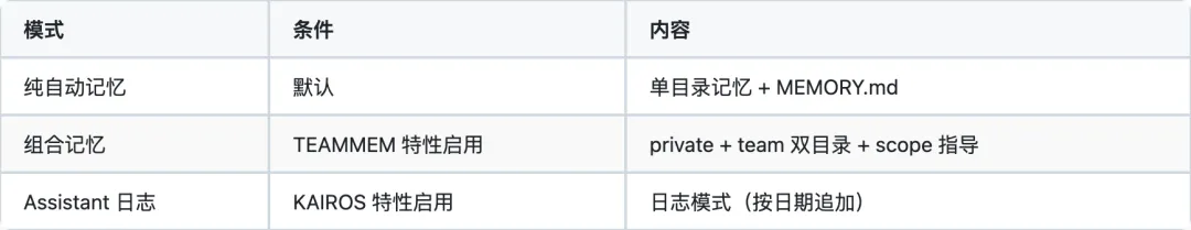 ## auto memoryYou have a persistent, file-based memory system at `~/.claude/projects/.../memory/`.## Types of memory[四种类型的详细说明和使用指南]## What NOT to save in memory[排除规则]## How to save memoriesStep 1: 写入带 frontmatter 的 .md 文件Step 2: 在 MEMORY.md 添加一行指针(~150 字符)## When to access memories[访问规则]## Before recommending from memory[验证规则]## Memory and other forms of persistence[与 Plan、Tasks 的区分]## MEMORY.md[MEMORY.md 的实际内容,或 "currently empty"]5.2 三种模式
