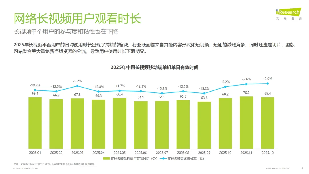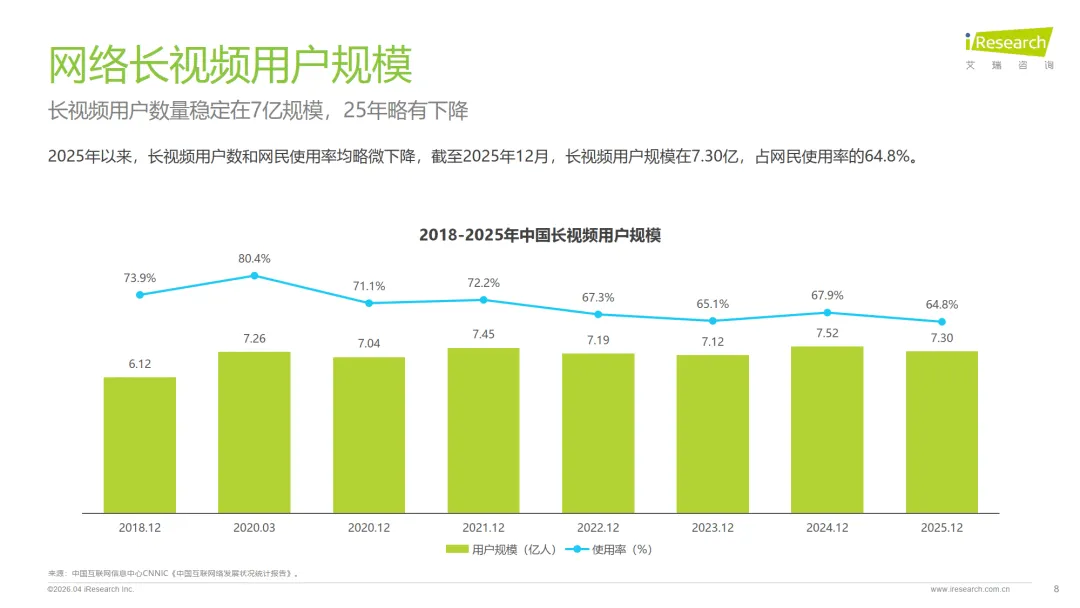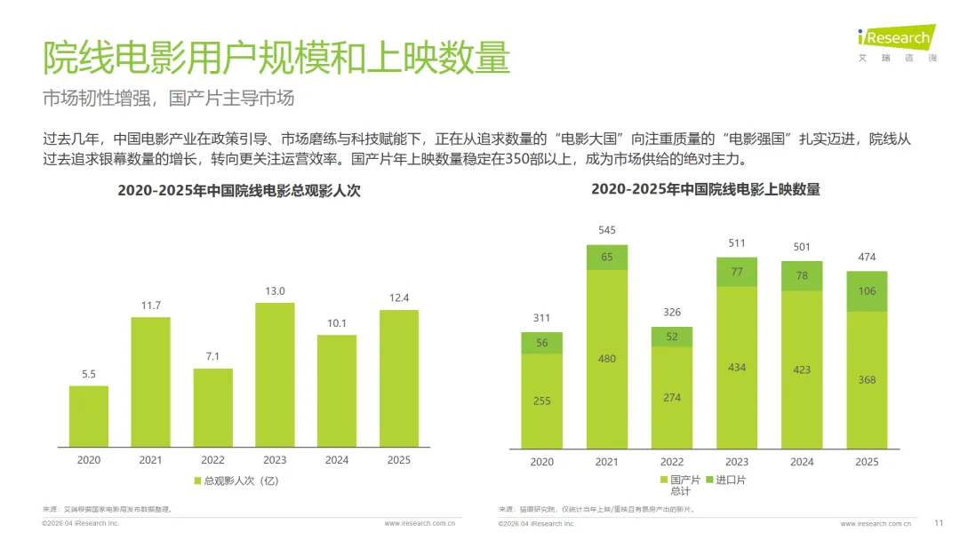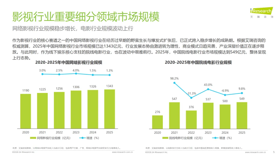 ,《哪吒之魔童闹海》《繁花》等作品投入高额成本,扬州影视基地等硬件支撑行业升级。市场规模方面,2025 年网络影视行业达 1343 亿元,呈稳步增长;院线电影行业 549 亿元,波动上行。网络影视以用户付费(50%-60%)、广告(20%-30%)为核心营收;电影以院线发行(80%-90%)为主,非票房收入逐步拓展。用户层面,长视频用户规模稳定在 7.3 亿,但日均使用时长持续下滑,剧集、综艺产量减量提质,国产片主导院线市场。