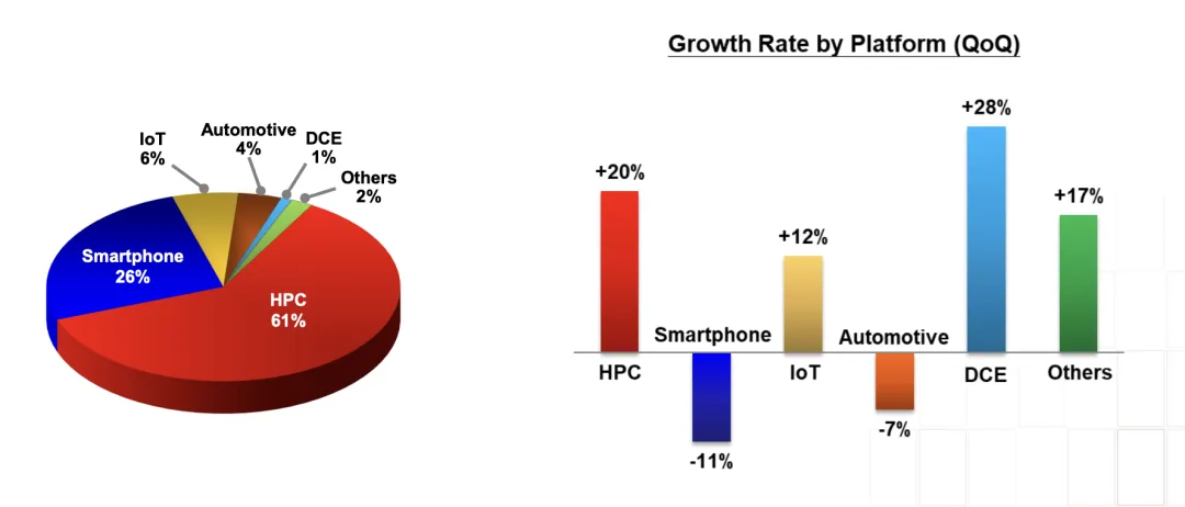 分业务看,不同平台来看,HPC环比增长20%,收入占比61%,智能手机环比下滑11%,占比26%,IOT环比+12%,占比6%。