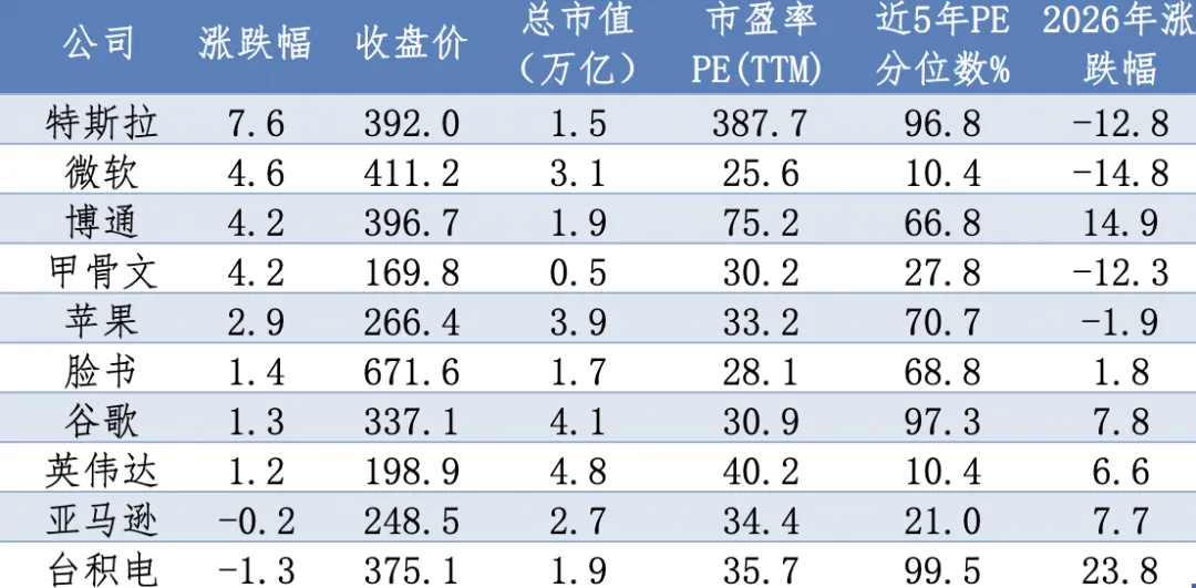 行情方面,昨天NDX在Mag10的带动下继续大幅上涨,创下历史新高,收涨1.4%,TTM市盈率为35.6倍,处于近五年70%的分位数水平。Mag10多数收涨,总市值、估值情况如下: