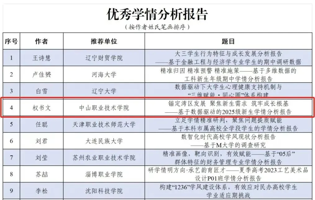 近日,教育部高校思想政治工作队伍培训研修中心公布2025年高校思想政治工作优秀文章征集活动评选结果。我校学生工作部(武装部)学生管理科科长权书文撰写的《锚定湾区发展聚焦新生需求筑牢成长根基——基于数据驱动的2025级新生学情分析报告》,荣获“优秀学情分析报告”奖项,充分彰显了我校在思想政治工作理论研究及学生工作精准化实践方面的突出成效。