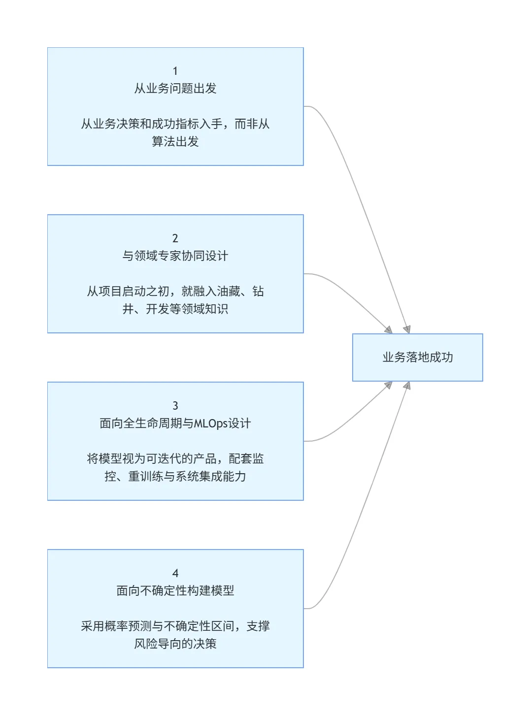 从问题出发。 研究应从明确定义的运营决策和成功指标开始。无论目标是减少非生产时间、提高采收率还是最小化停机时间,模型评估都应反映业务价值而非仅准确性。这要求研究人员在选择算法方法之前投入足够时间了解运营约束,确保问题表述本身反映工业现实。