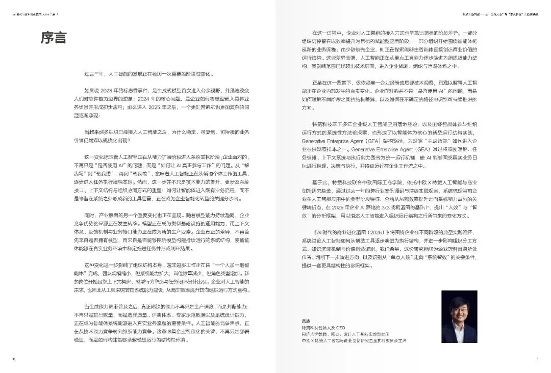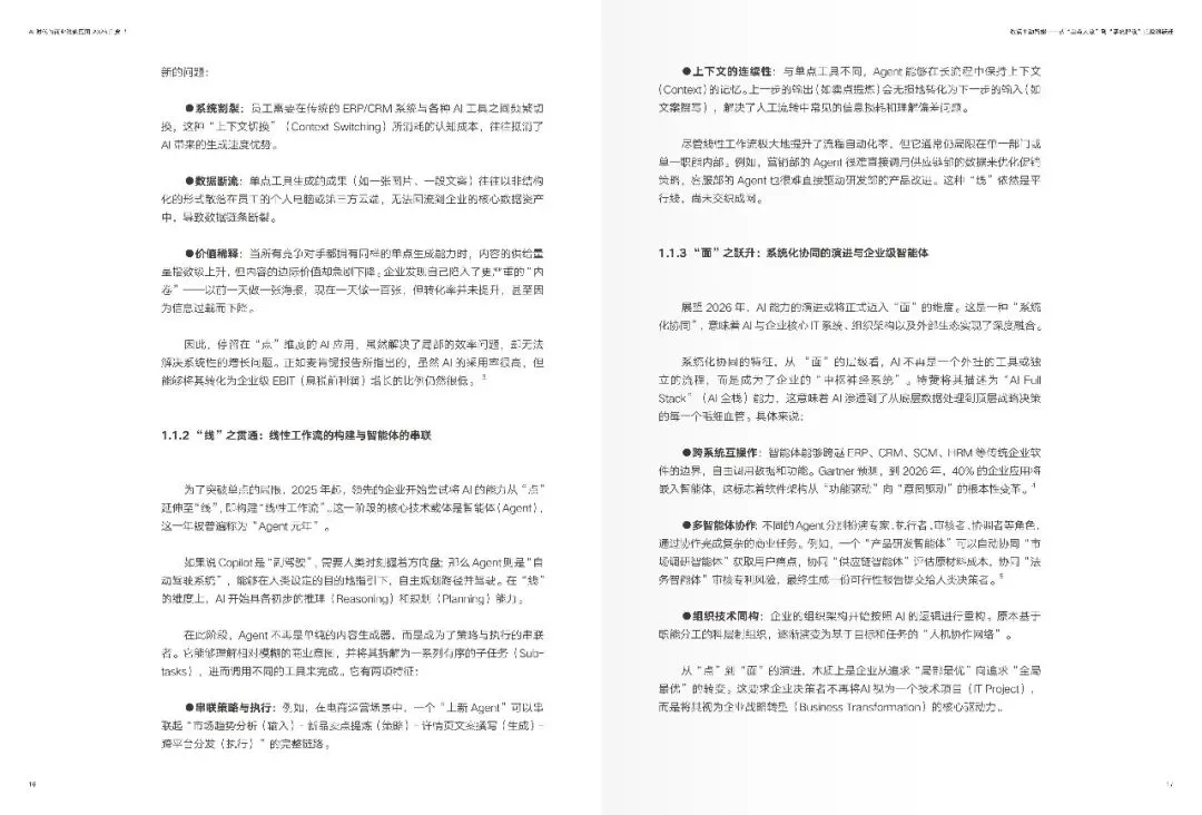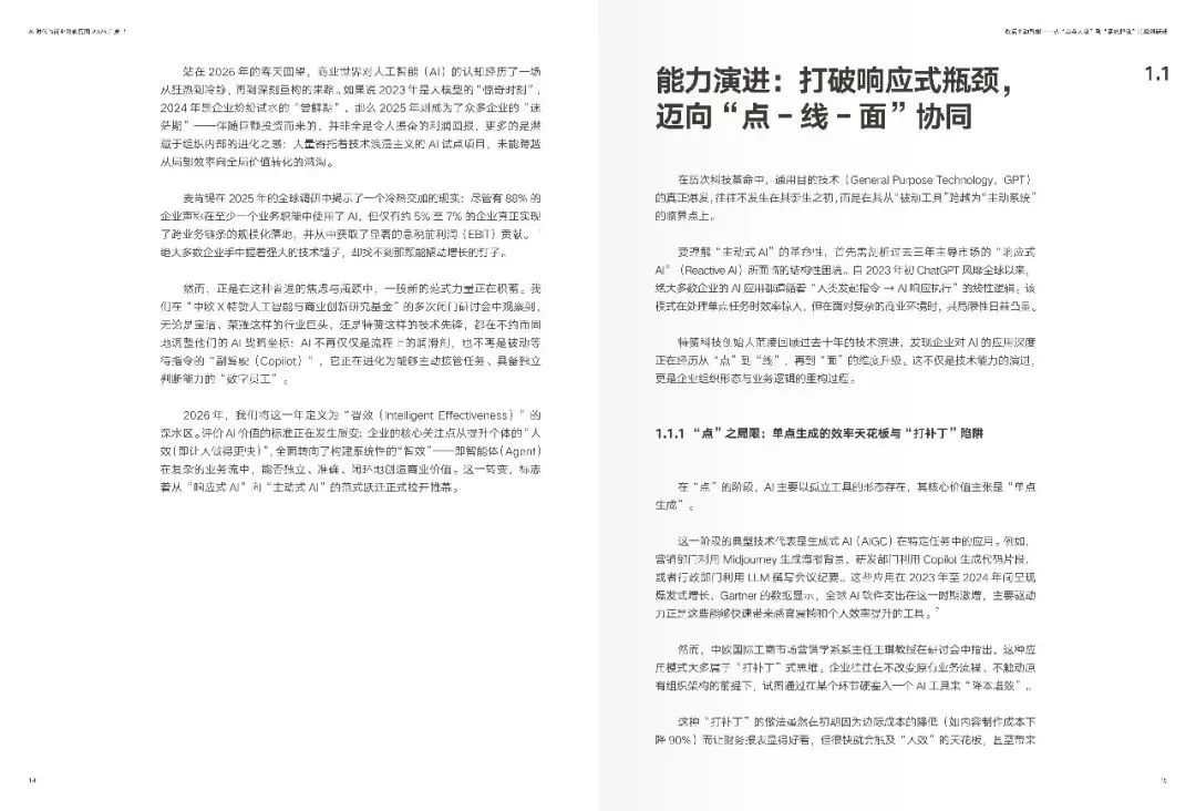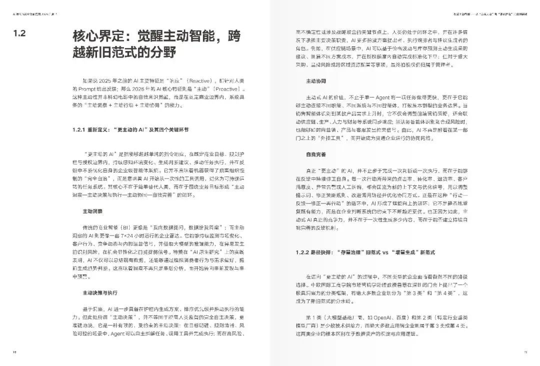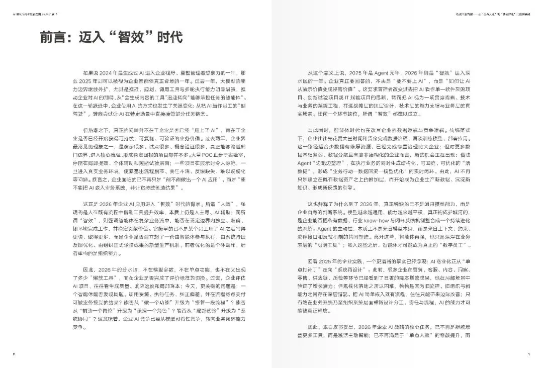 报告表明,二零二五年乃是智能体即 Agent 的元年,二零二六年便步入“智效”的深水区。往昔,AI 主要充当“副驾驶”这一角色,需等待人类下达指令之后才生成内容或者给出建议;然而当下,处于领先地位的企业已然开始促使AI 在既定的商业边界范围之内主动发觉环境的变化,生成判断以及建议,推动任务的执行,并且在反馈过程当中持续地自我完善。这种“更具主动性的AI”,并非那种科幻般的自我意识自发觉醒,而是借助意图理解、任务编排、上下文记忆以及闭环反馈等一系列机制,使得智能体切实承担起原本得靠人类持续付出精力的判断、执行以及协同任务。进而企业竞争的关键要点由此从“是否运用了AI”转变为“能不能将AI融入经营系统并稳定地创造出可被验证的价值”。
