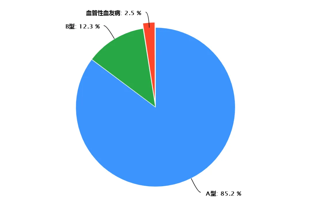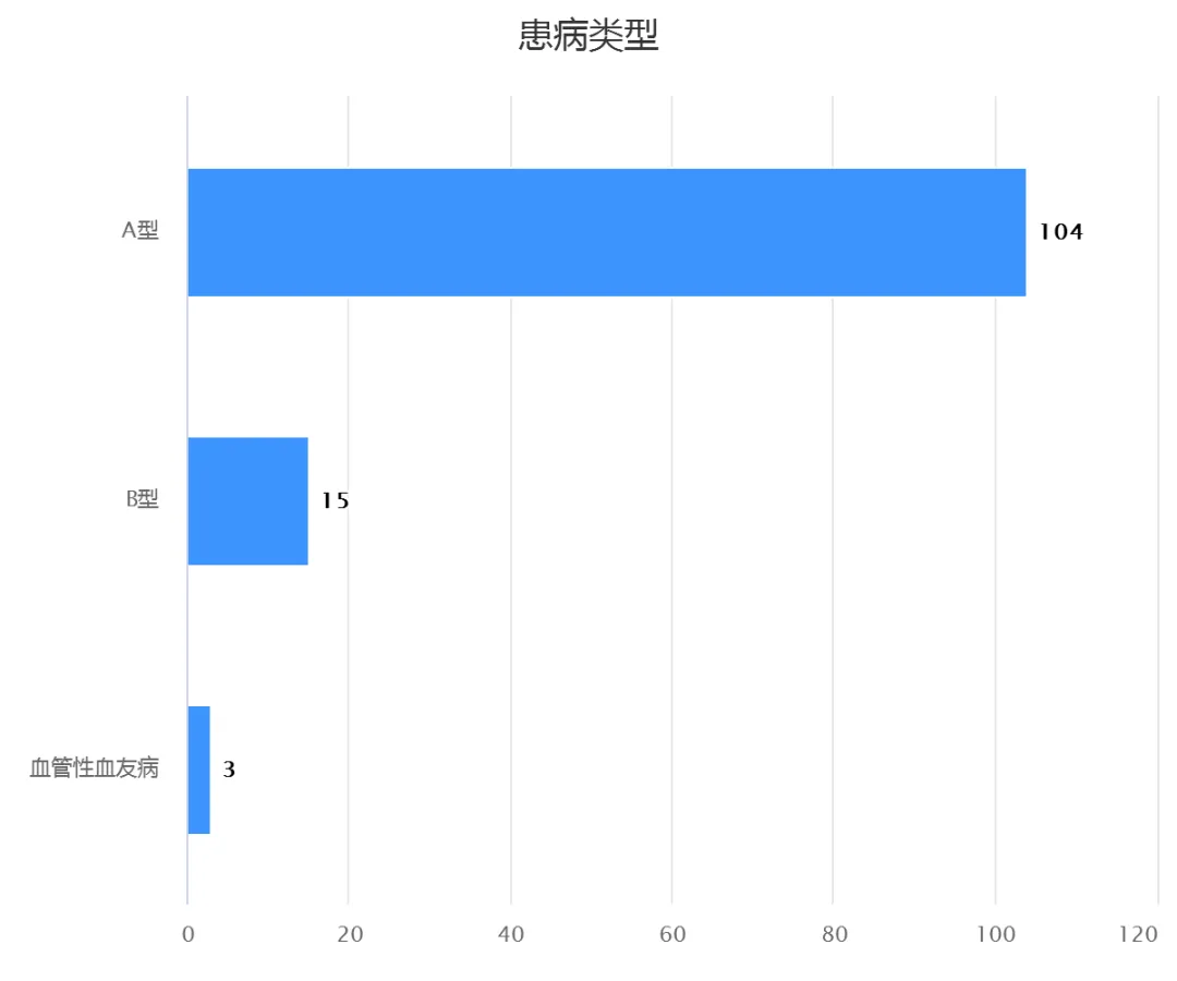 - 患病类型:血友病A患者104人,占84.2%;血友病B患者15人,占12.3%;血管性血友病患者3人,占2.5%。血友病A是主要类型。(见图3、图4)