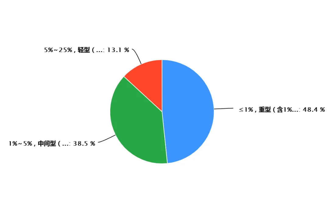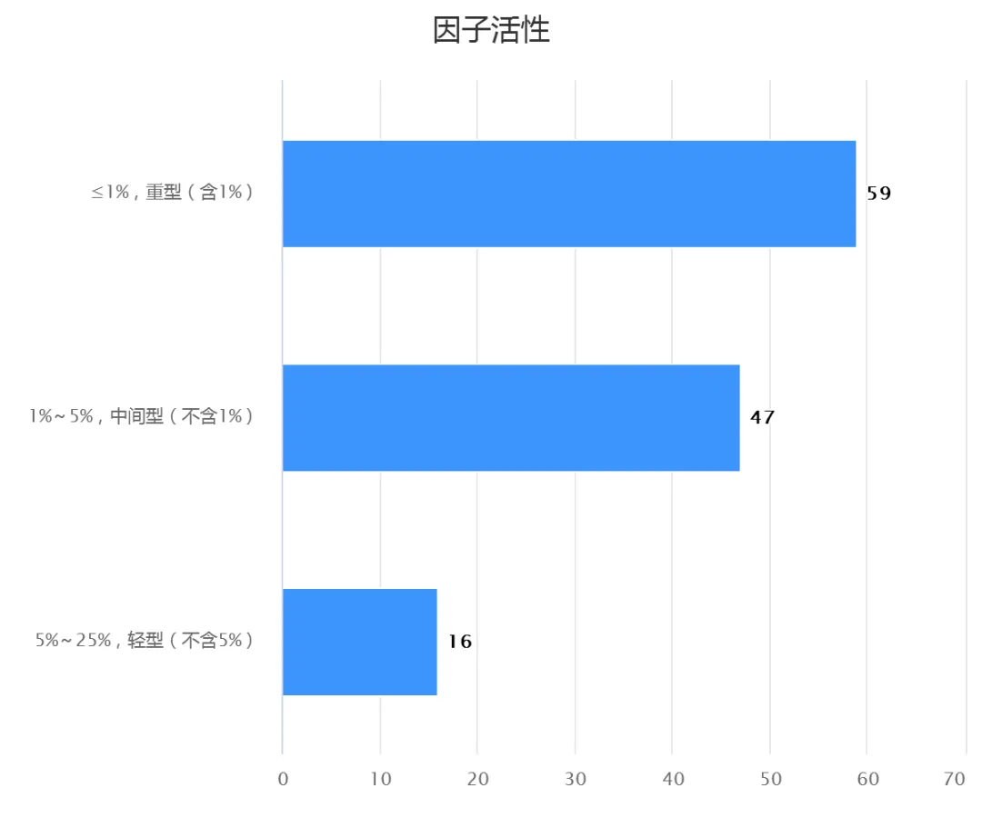 - 因子活性与疾病严重程度:依据世界血友病联盟标准,重型患者(因子活性≤1%)59人,占48.4%;中度患者47人,占38.5%;轻度患者16人,占13.1%。中重度患者合计占比高达86.9%,表明无锡市血友病患者群体对长期、规范替代治疗有极高依赖性。(见图5、图6)