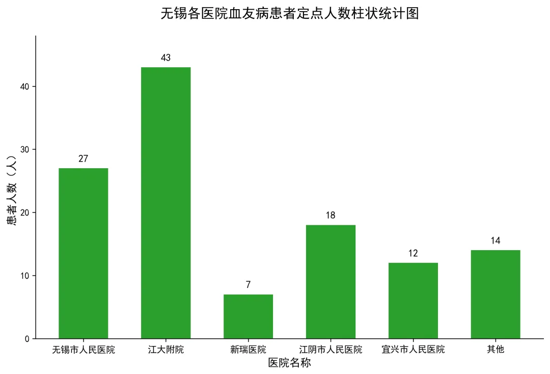 无锡市已初步建成覆盖全市的血友病诊疗网络。江阴市人民医院和无锡市人民医院先后于2023年12月和2025年3月通过国家级评审,被正式授牌“国家血友病治疗中心”,标志着无锡地区血友病诊疗规范化、标准化水平获得国家级认可。全市共有6家定点医院,分别为:无锡市人民医院、无锡市儿童医院、江南大学附属医院、新吴区新瑞医院、江阴市人民医院、宜兴市人民医院。形成了以国家级中心为引领、多家医院协同服务的格局。(见图7B)
