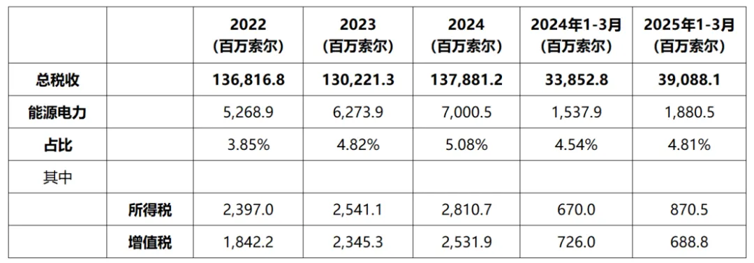 2024年能源和采矿业贡献了273.60亿索尔税收收入,同比增长4.6%,占全国总税收的17.6%,其中电力贡献税收收入为70.01亿索尔,同比增长11.6%,占全国总税收的4.5%。其他财政收入方面,与电力相关的水力能源特许权金(canon hidroenergético)2024年达3.01亿索尔,占能源及矿产行业总财政收入的1.9%。