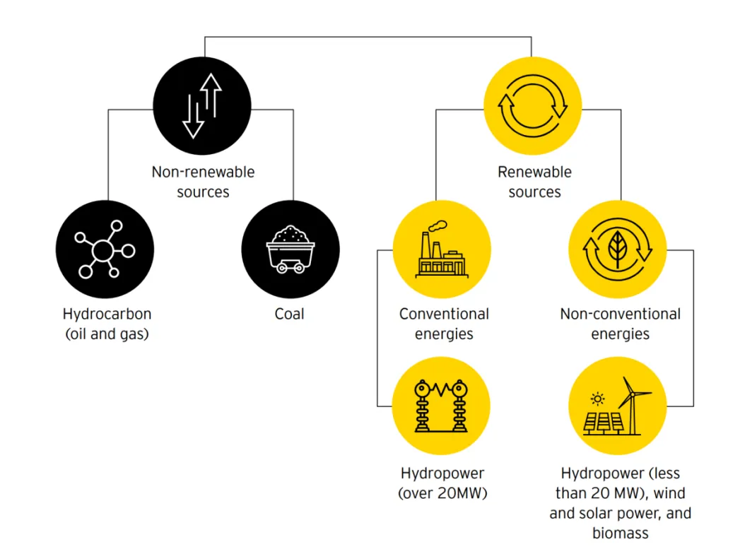 可再生能源:传统能源(装机容量超过20MW的大型水电)、非传统能源(装机容量低于20MW的小型水电、风能、太阳能、生物质能)