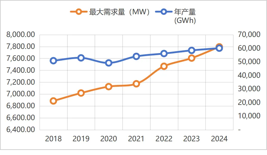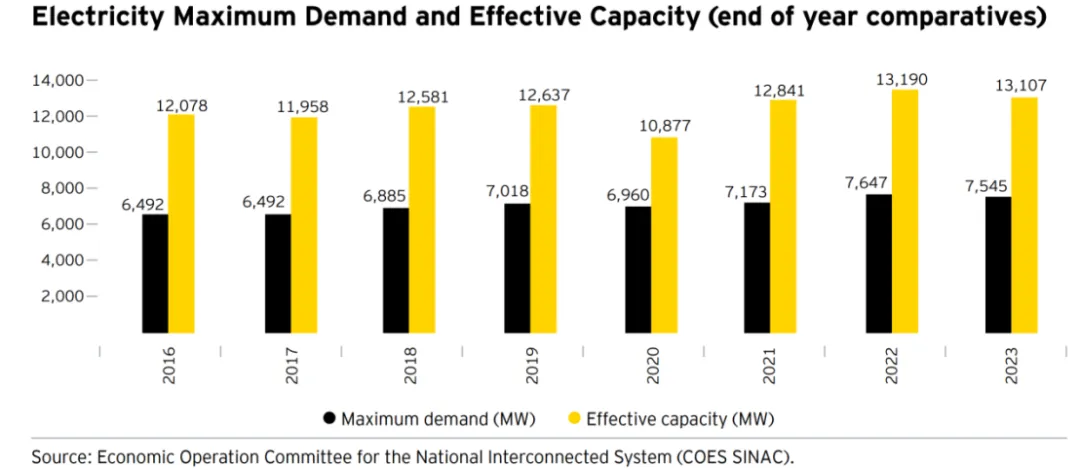 近年来,秘鲁的电力消费量持续增长,但当地市场长期存在“供应过剩”的情况,即有效容量大幅高于最大负荷,如下图所示: