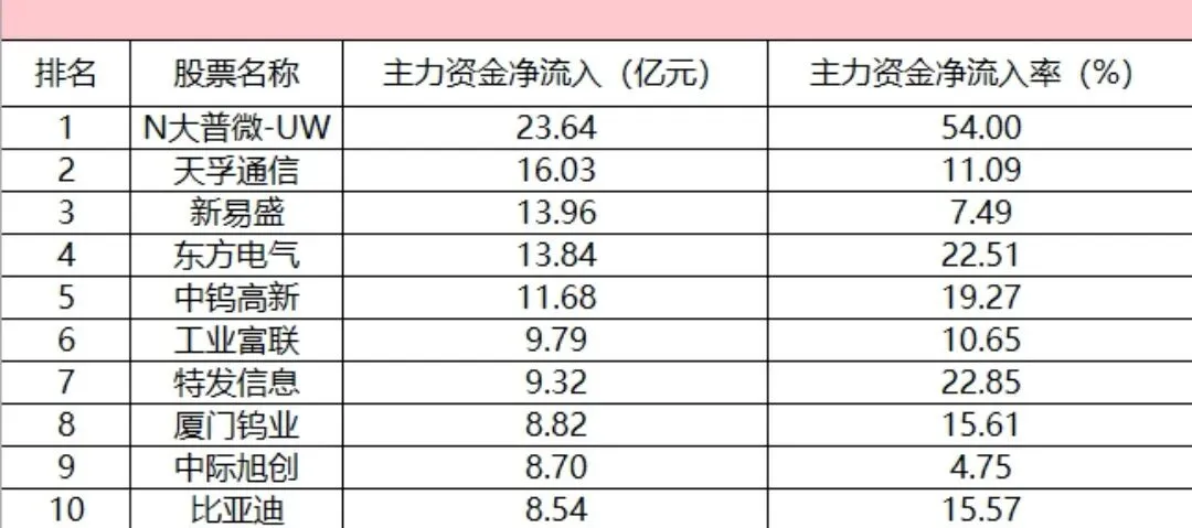 四,个股方面的净流入,今(16)日,N-大普微-UW,主力资金净流入超23.64亿元居首位。